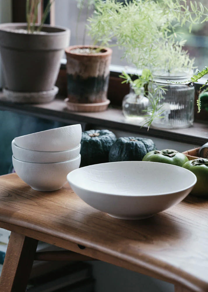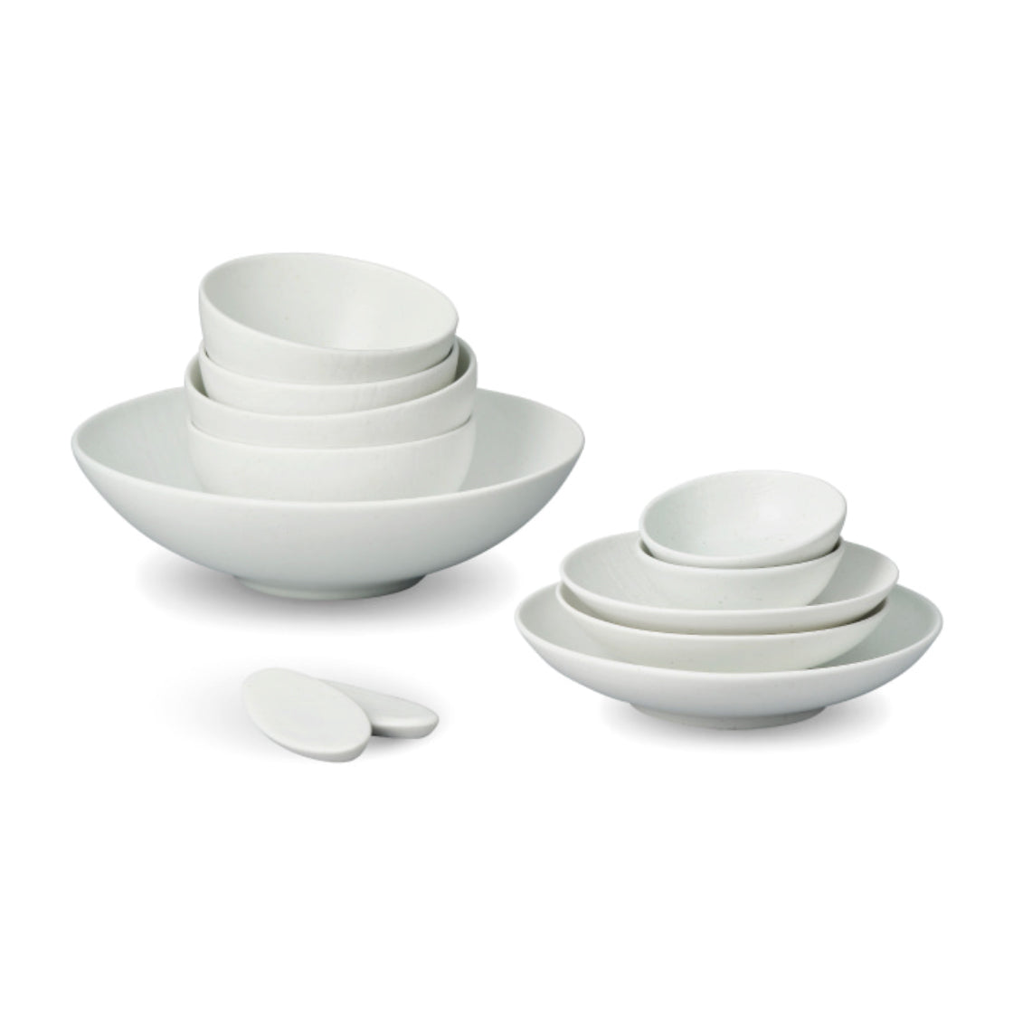 Two signature glazes bring the collection to life. Seolbaek (Snow White · 설백) radiates a pure, luminous calm, while Cheongbaek (Blue White · 청백) carries a soft elegance — with a subtle blue tint — that makes every dish look all the more appetizing.